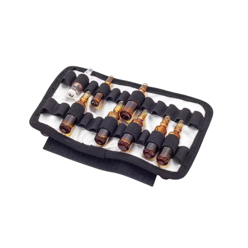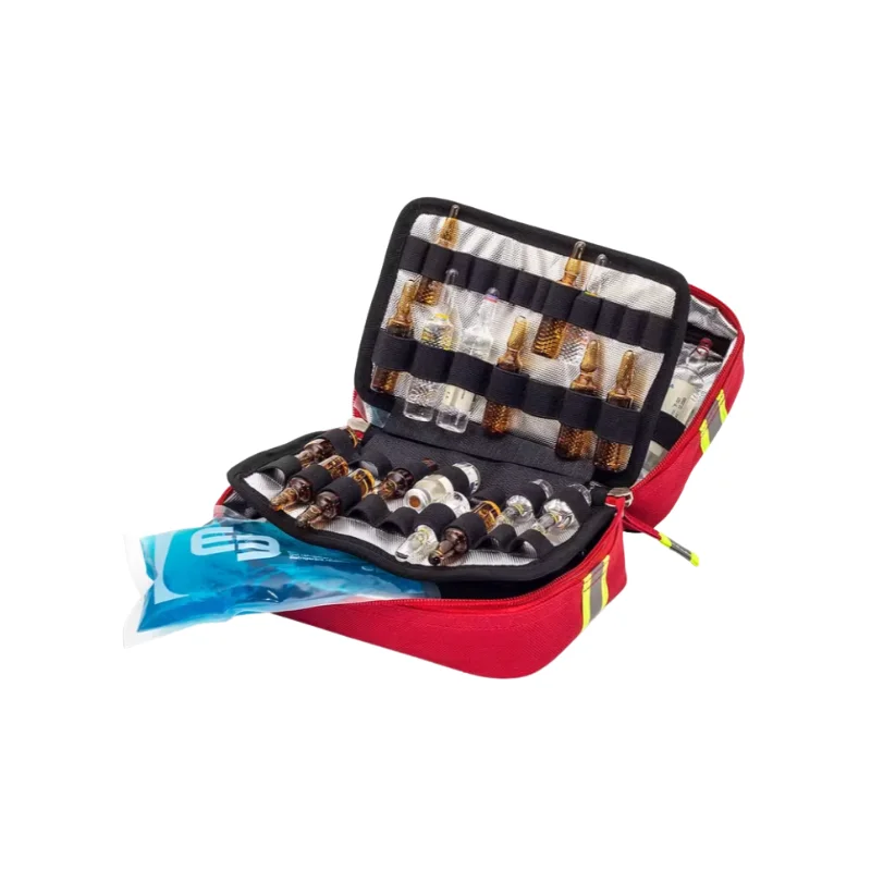 Estuche compacto diseñado para el transporte seguro de hasta 84 ampollas de diversos volúmenes. Interior configurado con 4 bandejas isotérmicas móviles para una organización personalizada y protección térmica. Fabricado en Poliéster 600D, cuenta con asa de transporte ergonómica y bandas reflectantes para mayor visibilidad. Ligero (0,26 kg) y eficiente, es el maletín ideal para el manejo de medicación en servicios de urgencias y traslados médicos.