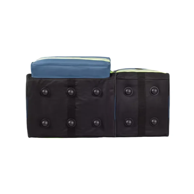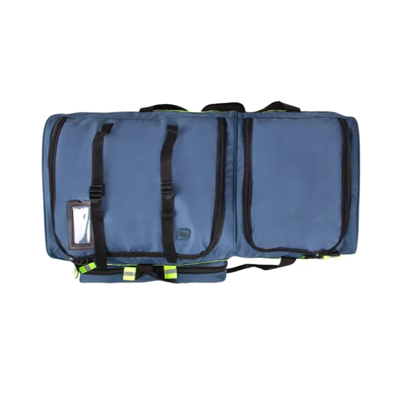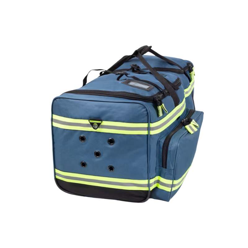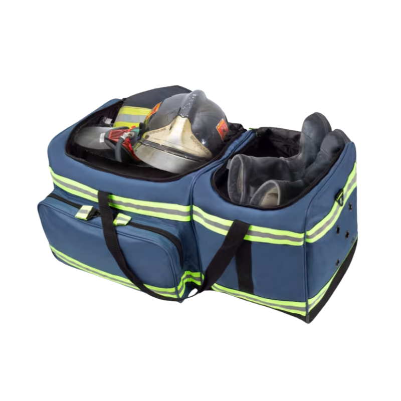 Bolsa de gran capacidad (100L) diseñada específicamente para el transporte de todo el equipo de bombero. Fabricada en Poliéster 600D de alta resistencia. Cuenta con dos compartimentos principales (uno para EPI/casco y otro para botas), bolsillo frontal amplio, bolsillo interno con cremallera y base reforzada extraíble para facilitar la higiene. Incluye bandas reflectantes de alta visibilidad, asas perimetrales reforzadas, bandolera acolchada y sistema de ventilación lateral.