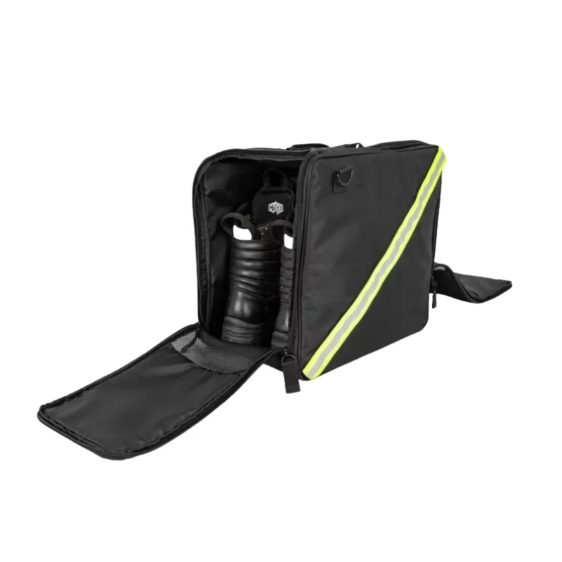 Bolsa bandolera especializada para el transporte seguro de casco y botas de seguridad. Fabricada en Poliéster 1000D resistente a condiciones adversas. Incluye interior espacioso de 40 litros diseñado para evitar rozaduras, bandolera acolchada ajustable para transporte manos libres, cremalleras de alta calidad y anillas «D» para accesorios. Equipada con banda reflectante diagonal de alta visibilidad. Ligera (1.14 kg) y duradera, la elección profesional para el cuidado de tu EPI