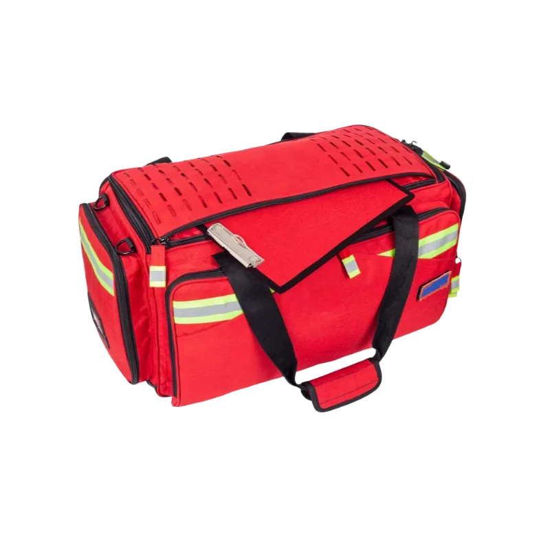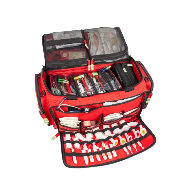 Maletín profesional de máxima capacidad con interior totalmente configurable. Incluye ampulario isotérmico (113 ampollas), panel de 4 estuches extraíbles codificados por colores y espacio optimizado para equipos de oxígeno y RCP. Destaca por su versatilidad táctica: sistema MOLLE láser, anillas de rescate aéreo, bolsillos con carga USB y base reforzada antivuelco. La solución más completa y ergonómica para intervenciones críticas.
