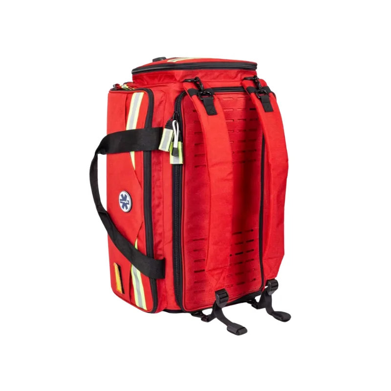Además, la bolsa cuenta con un compartimento extraíble con cuatro bolsillos transparentes que permiten una fácil visualización del material alojado, y con cremalleras con código de color internacional para mejorar la organización y la clasificación del mismo. También incluye un ampulario isotérmico, con capacidad para aproximadamente 113 ampollas.