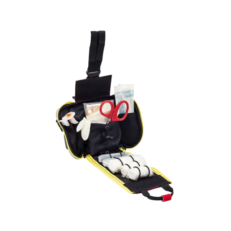 Botiquín de acceso rápido pernera de tamaño medio para la organización del material de curas. Su doble sistema de sujeción, regulable en altura, cuenta con bandas elásticas antideslizantes para ajustarlo a la pierna.
