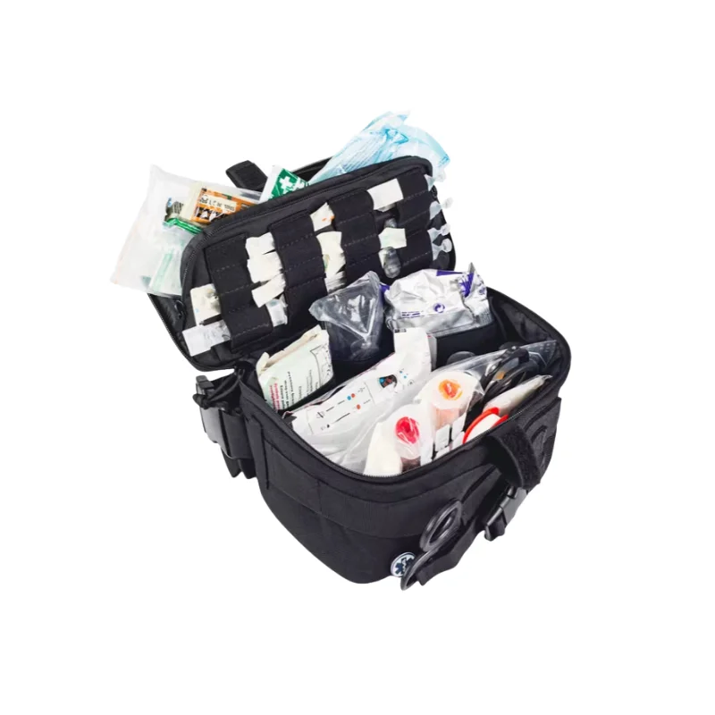 Este botiquín riñonera y pernera está diseñado específicamente para intervenciones rápidas en emergencias, ya que el kit y su contenido son muy compactos. Se puede sujetar de diferentes maneras (mano, cintura y pierna), lo que lo hace adecuado para todo tipo de entornos y situaciones posibles.