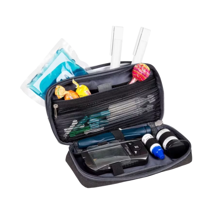 De diseño compacto, moderno e informal. Este estuche para diabéticos posee un tamaño óptimo para albergar las jeringuillas de insulina, además de un sin fin de múltiples bolsillos y bandas elásticas para alojar todo el material necesario para la medición y tratamiento de la diabetes