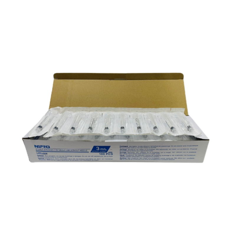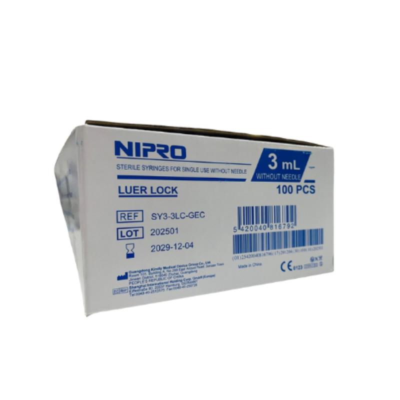 Las jeringas se presentan en caja de 100 unidades, facilitando el control logístico y la reposición rápida en clínicas y hospitales. El envase incluye referencia, número de lote, fecha de caducidad y etiqueta Nipro oficial, garantizando trazabilidad y conformidad sanitaria.