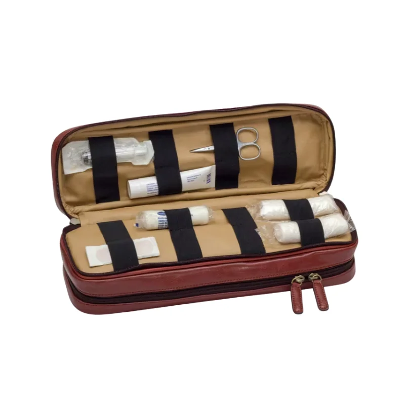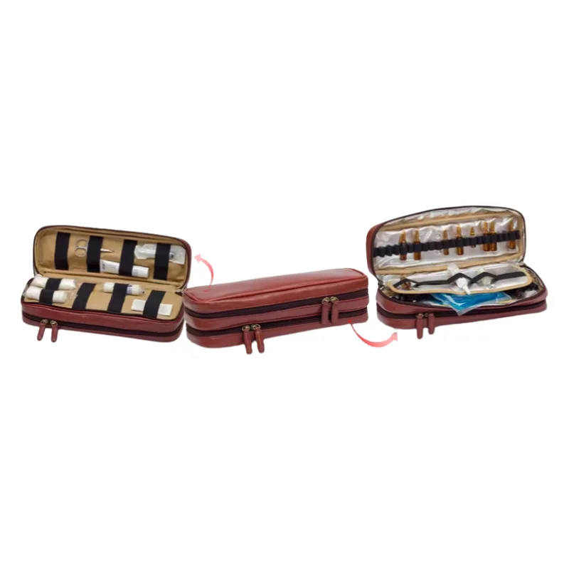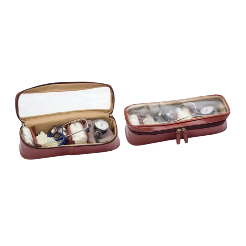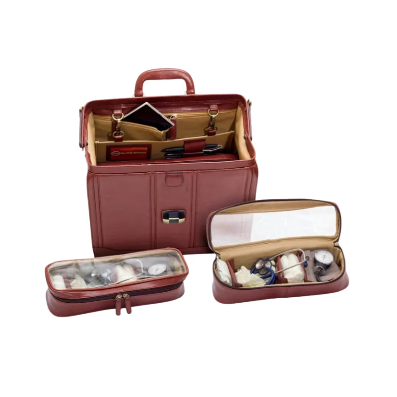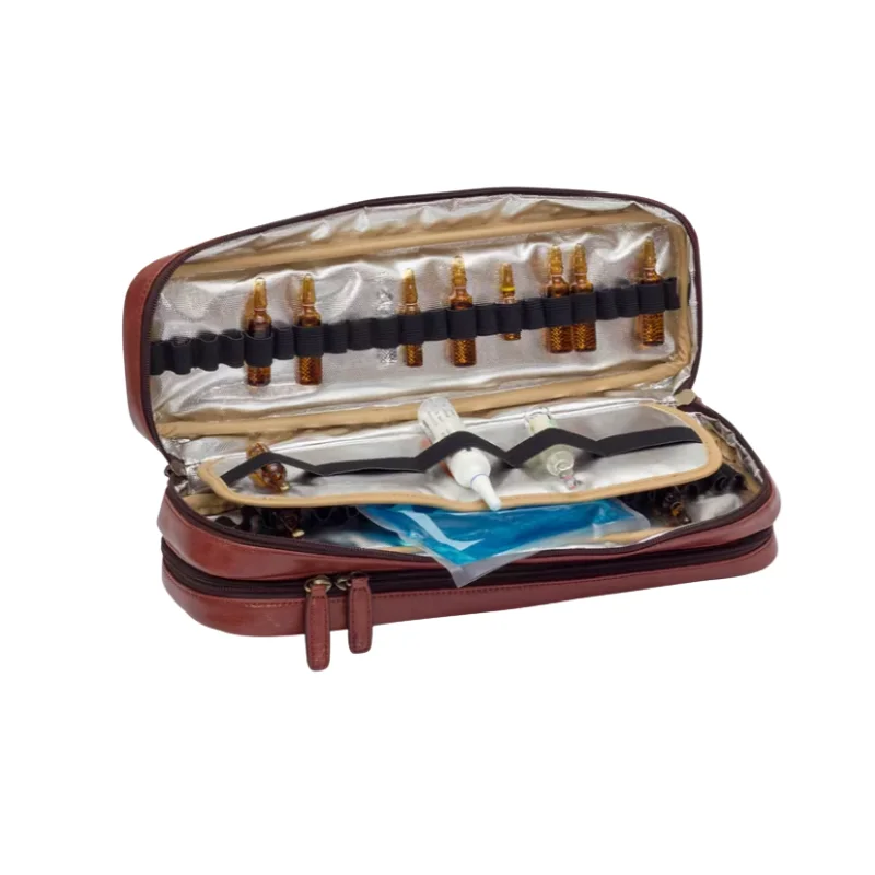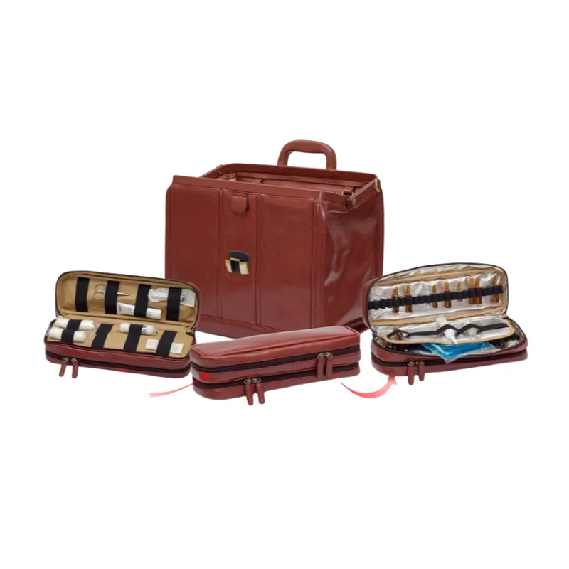 Maletín de alta gama fabricado en piel natural con cierre de seguridad con llave. Diseño distinguido: Estética clásica tipo «cabás» de gran elegancia. Organización técnica: Interior modular con compartimentos extraíbles, ampulario isotérmico (38 ampollas) y panel porta bolígrafos/tarjetero. Movilidad: Asa superior ergonómica y bandolera incluida para un transporte cómodo. La pieza definitiva para el profesional que busca combinar una imagen clásica y prestigiosa con una alta capacidad de organización.