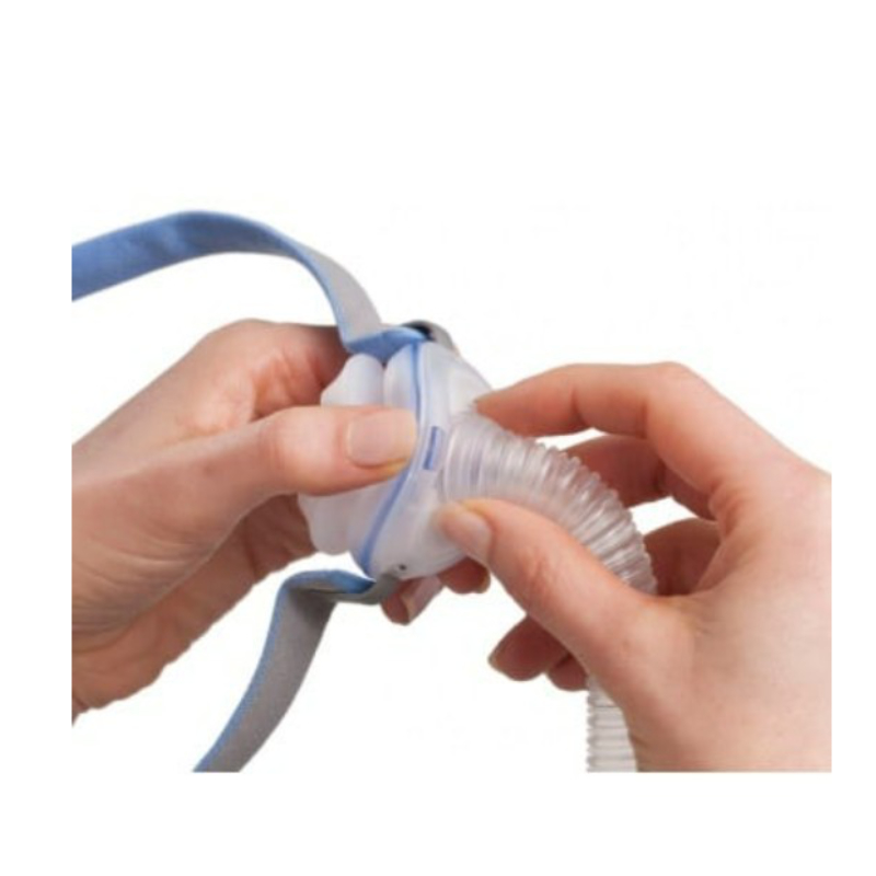 La mascarilla cuenta con una manguera ultraflexible que sigue el movimiento del usuario durante la noche, permitiendo cambios de posición sin afectar el sellado ni la comodidad. Es ideal para personas activas durante el sueño, ya que la mascarilla permanece estable y ajustada incluso si se mueve o rueda varias veces.