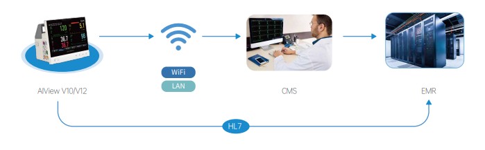 El AI VIEW se puede conectar a una estación central de monitorización (CMS) a través de redes alámbricas e inalámbricas para permitir la observación a pie de cama, así como la conexión directa a una historia clínica electrónica (EMR) de terceros a través de la salida HL7