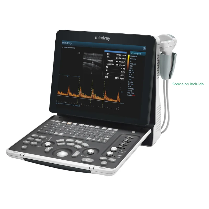 Ultrasonido portátil Mindray DP-50 Expert con monitor LCD de alta resolución de 15″, 2 conectores para sondas, disco duro de 500 GB, 4 puertos USB, paquete de software múltiple y sin sondas.